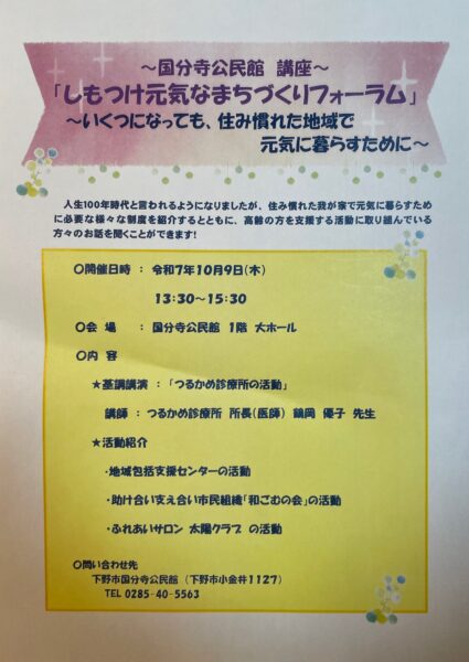2025/10/5 『しもつけ元気なまちづくりフォーラム』のご案内 2025年10月9日(木)13:30より、国分寺公民館講座ということで『しもつけ元気なまちづくりフォーラム~いくつになっても住み慣れた地域で元気に暮らすために~』が開催されます。会場は国分寺公民館1階大ホールです。基調講演ということで「つるかめ診療所の活動」と題して、所長の鶴岡優子が登壇します。地域包括支援センター、助け合い市民組織「和ごむの会」、ふれあいサロン太陽クラブの活動報告もあります。詳細、問合せ等は添付のチラシをご参照ください。 鶴岡浩樹