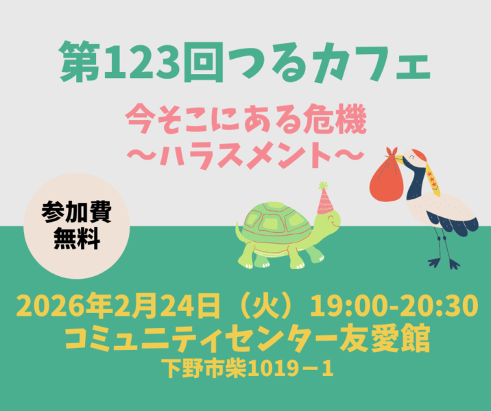2026/2/24 第123回つるカフェ開店! 下野市の梅も咲きはじめました〜 第123回つるカフェのご案内になります 日時:2026年2月24日(火)19時~20時30分 場所:下野市コミュニティーセンター友愛館 参加費:無料 ZOOMなし対面のみ 在宅ケアに関わる専門職だけでなく、市民の方の参加も歓迎します!もちろん下野市民だけでなく、小山市民も、栃木市民も、宇都宮市民も、上三川町民も、栃木県民でなくでも、つまり、誰でも歓迎です! 今年の9月は日本在宅医療連合学会の地域フォーラムも主管です。そのテーマ「すぐそこにある危機」を今にして、自分ごととして、考えます!災害対策とハラスメントを交互に考えていきます!